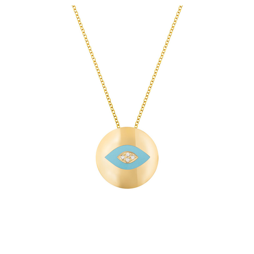 Μοντέρνο γυναικείο κολιέ μάτι από κίτρινο χρυσό Κ14 σε έναν στρογγυλό κυρτό δίσκο δύο όψεων σε ματ φινίρισμα ενσωματωμένο σε αλυσίδα, με διαμάντια και γαλάζιο κεραμικό στην όψη του.