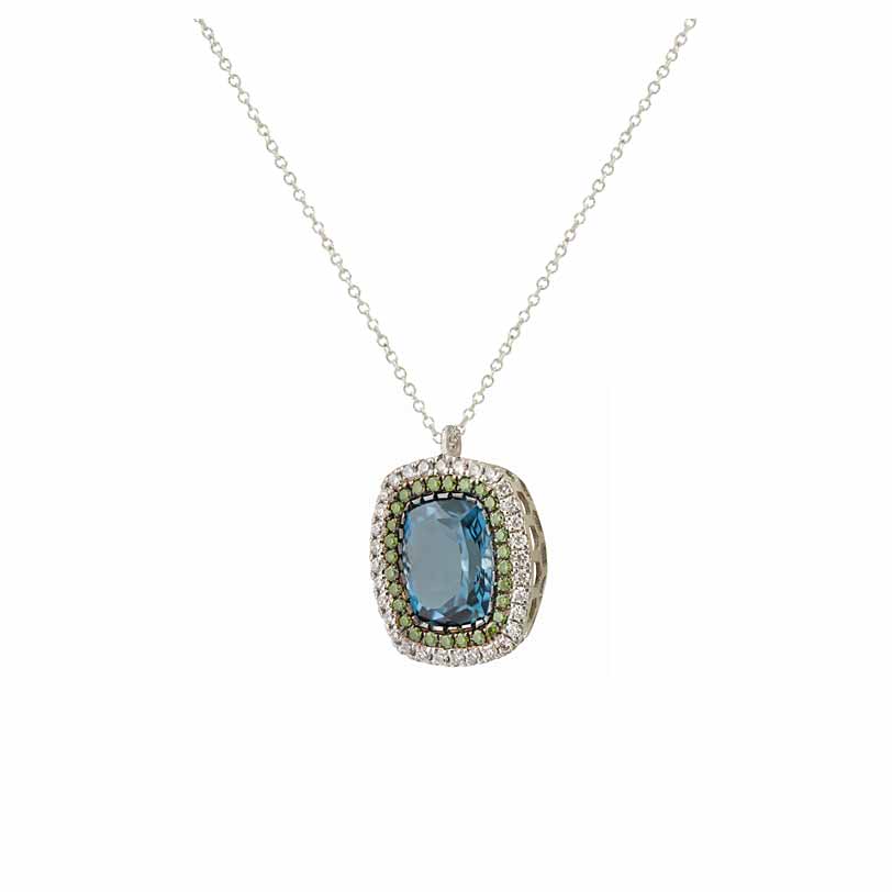Κολιέ ροζέτα από λευκόχρυσο Κ18 με ορθογώνιο ορυκτό τοπάζι London Blue στο κέντρο, 32 λευκά διαμάντια περιμετρικά και 28 πράσινα διαμάντια στη μέση.