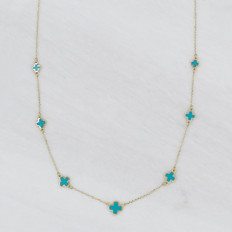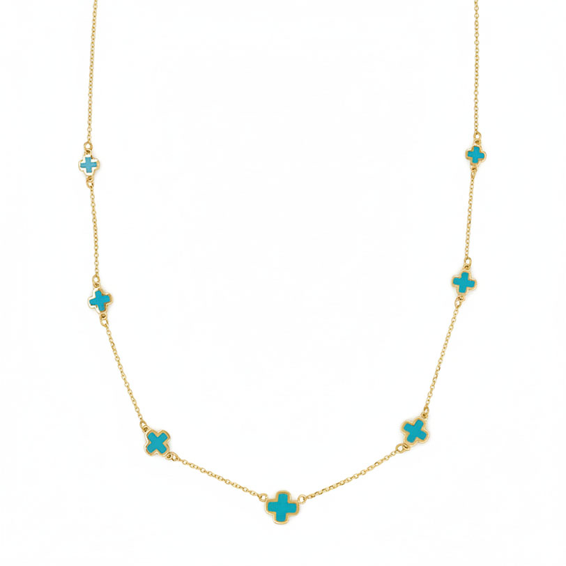 Ένα μοντέρνο γυναικείο κολιέ από κίτρινο χρυσό Κ9 με σταυρουδάκια σε γαλάζιο σμάλτο.