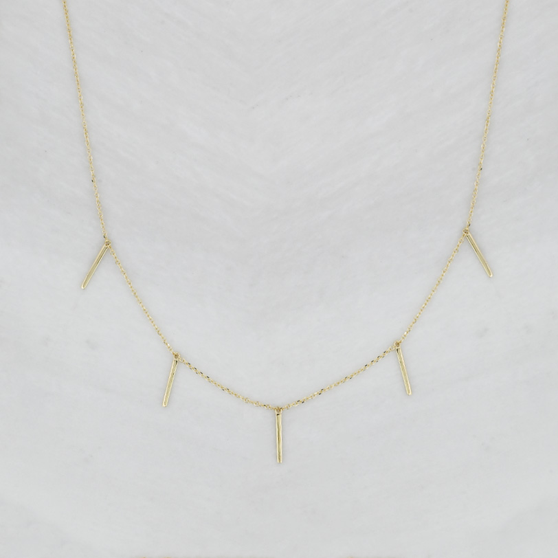 Ένα μοντέρνο γυναικείο κολιέ από κίτρινο χρυσό Κ9 με 5 λεπτές ράβδους κρεμαστές σε αλυσίδα.