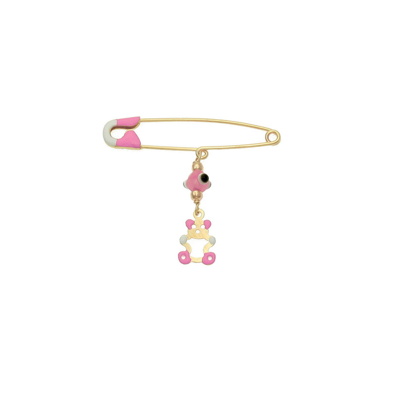 Παραμάνα για κορίτσι από χρυσό Κ9 με κρεμαστό αρκουδάκι από ροζ και λευκό σμάλτο και ροζ ματάκι.