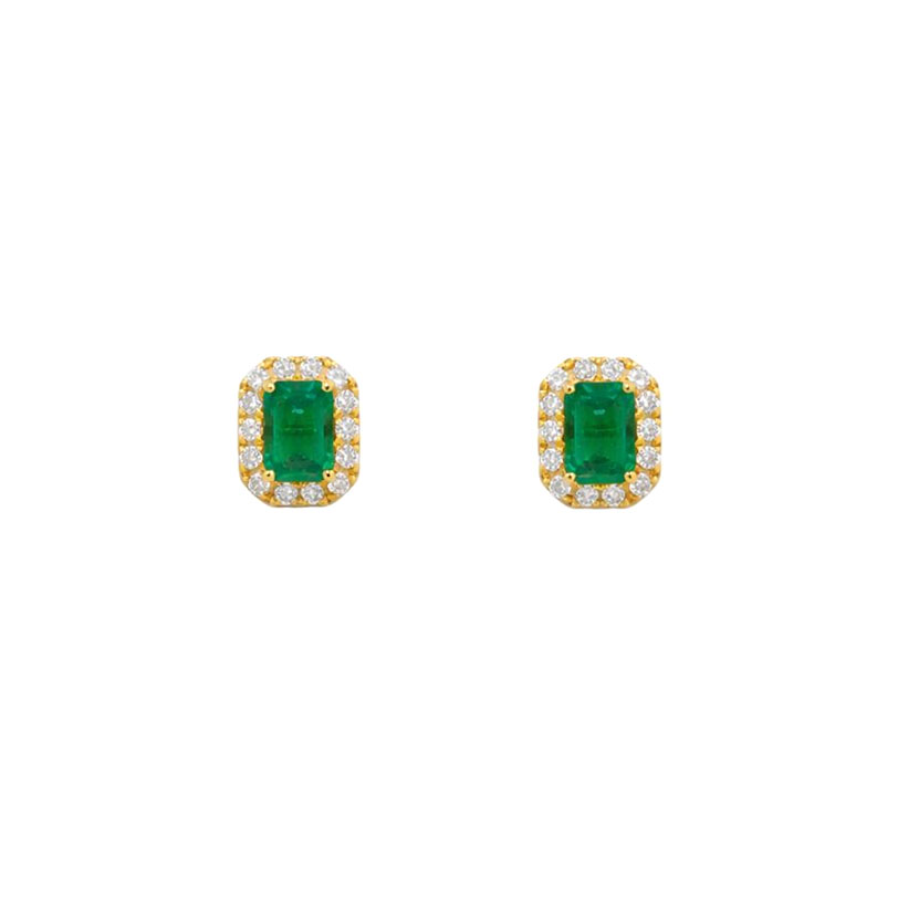 Κομψά σκουλαρίκια ροζέτες από κίτρινο χρυσό Κ18 με ορυκτό πράσινο σμαράγδι σε emerald cut και διαμάντια περιμετρικά.