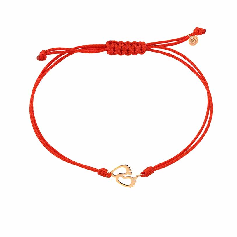 Ένα χαριτωμένο γυναικείο ή παιδικό βραχιόλι από ροζ χρυσό Κ14 με διακριτικές παιδικές πατουσίτσες περασμένες σε κόκκινο υφασμάτινο κορδόνι με δέσιμο μακραμέ.