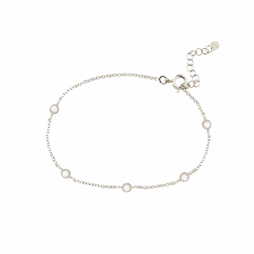Ένα μοντέρνο καθημερινό γυναικείο βραχιόλι από λευκόχρυσο Κ14 με 5 διακριτικά διαμάντια ενσωματωμένα σε αλυσίδα.