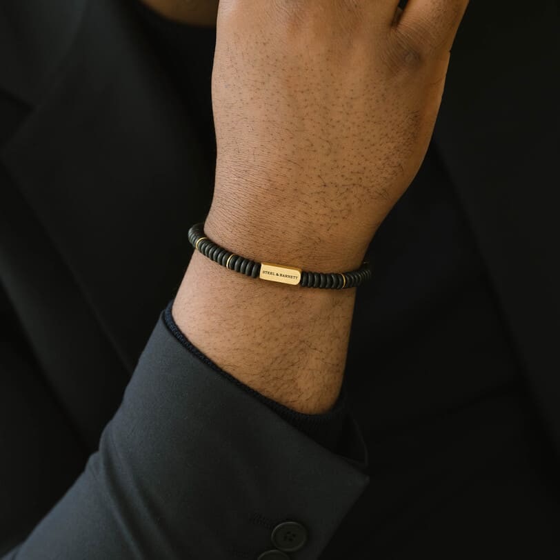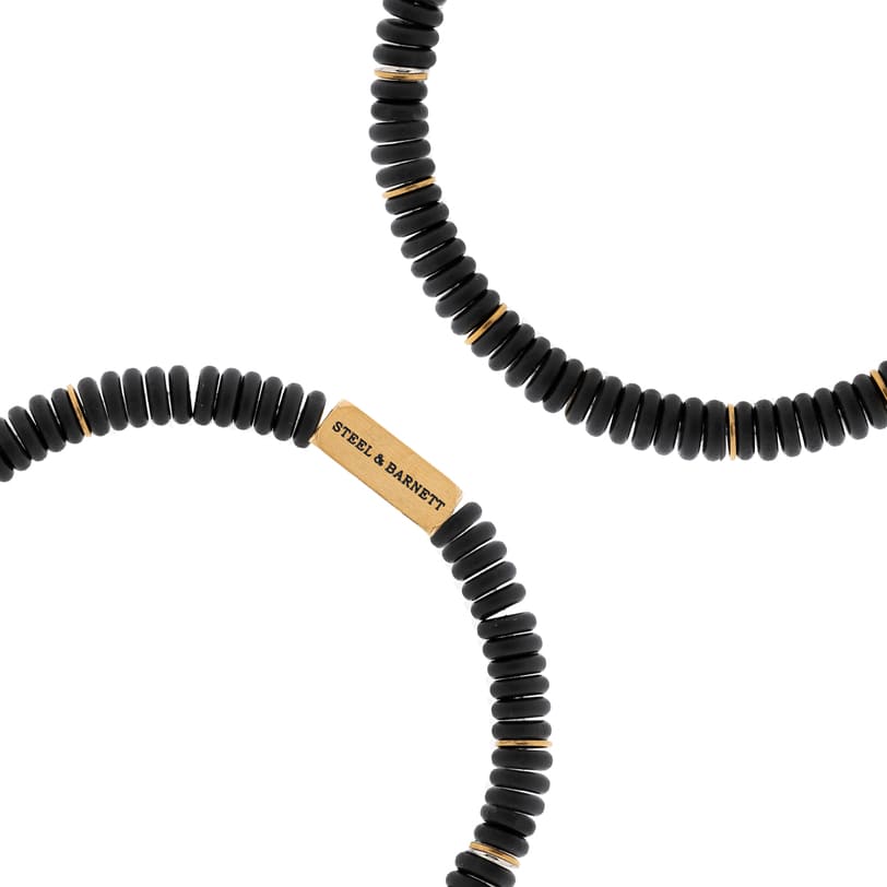 Μοντέρνο βραχιόλι ροζάριο από ματ ανοξείδωτο επιχρυσωμένο ατσάλι και ροδέλες από μαύρο όνυχα.