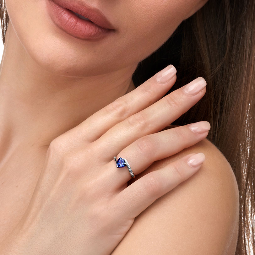 Δαχτυλίδι από λευκόχρυσο Κ18 με ορυκτό μπλε τανζανίτη σε κοπή trillion με διαμάντια στη μία πλευρά.