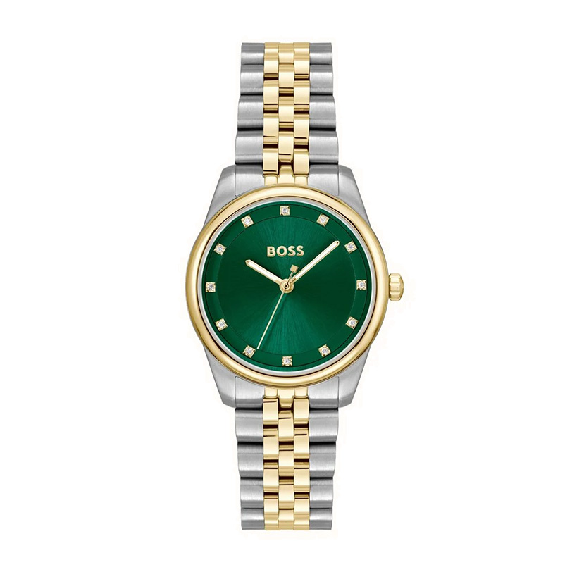 Γυναικείο quartz ρολόι HUGO BOSS Graceful 1502834 από τη σειρά BOSS, με πράσινο καντράν με πέτρες και δίχρωμο επίχρυσο ατσάλινο μπρασελέ.