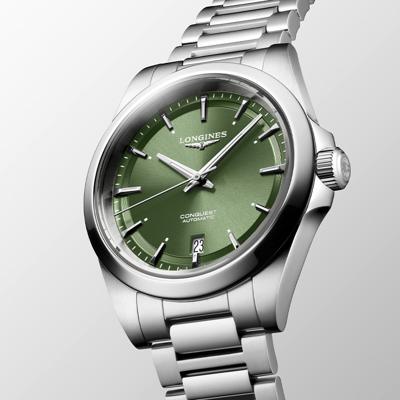 Ελβετικό αυτόματο ρολόι χειρός του οίκου LONGINES από τη σειρά Conquest L3.720.4.02.6 με ημερομηνία, πράσινο καντράν και μπρασελέ από ανοξείδωτο ατσάλι.