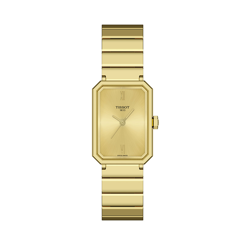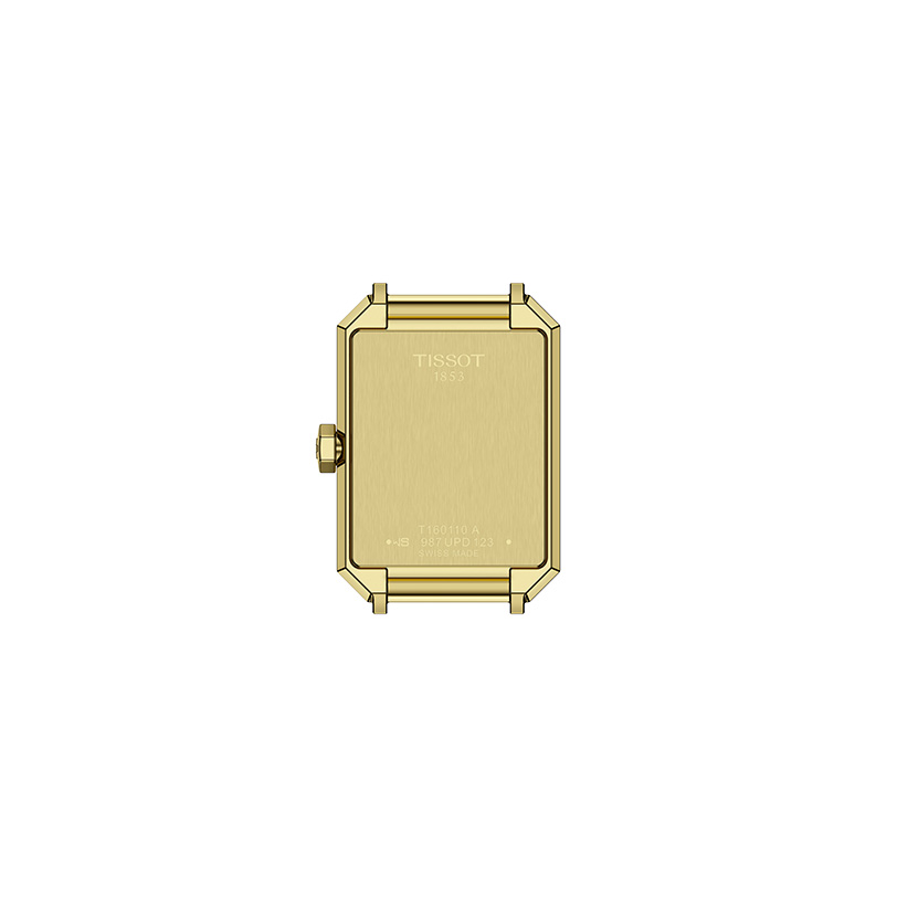 Γυναικείο ελβετικό quartz ρολόι του οίκου TISSOT SRV T160.110.33.023.00 με ορθογώνια κάσα, επίχρυσο καντράν και επίχρυσο ατσάλινο μπρασελέ.