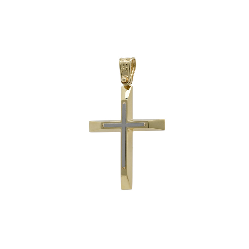 Ένας ιδιαίτερος βαπτιστικός σταυρός για αγόρι ή ανδρικός από κίτρινο χρυσό Κ14 σε λουστρέ φινίρισμα και λεπτό ματ λευκόχρυσο ένθετο.