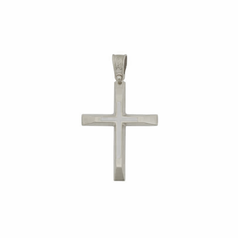 Ένας λιτός βαπτιστικός σταυρός για αγόρι ή ανδρικός από λευκόχρυσο Κ14 γυαλιστερό με ένθετο ένα ματ λευκόχρυσο τμήμα.