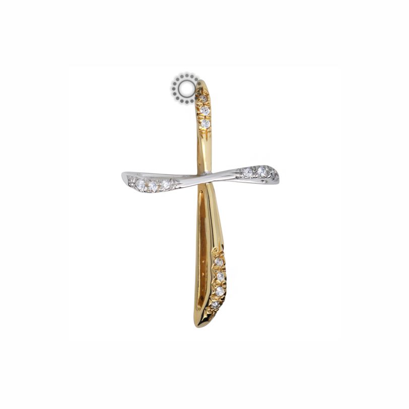 Ένας μοντέρνος γυναικείος σταυρός ή βαπτιστικός για κορίτσι από χρυσό Κ14 με ζιργκόν στα άκρα και ιδιαίτερο σχήμα με ενσωματωμένο κρίκο.