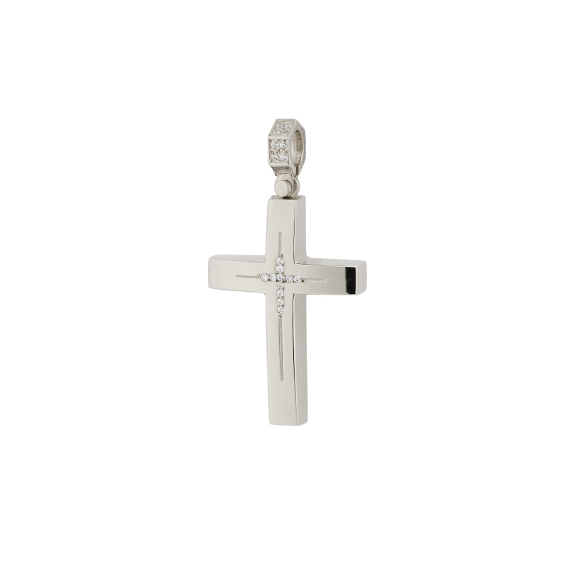 Ένας μοντέρνος σταυρός βάπτισης για κορίτσι ή γυναικείος από λευκόχρυσο Κ14 με γυαλιστερό φινίρισμα διακοσμημένος με ζιργκόν στο κέντρο και τον κρίκο του.